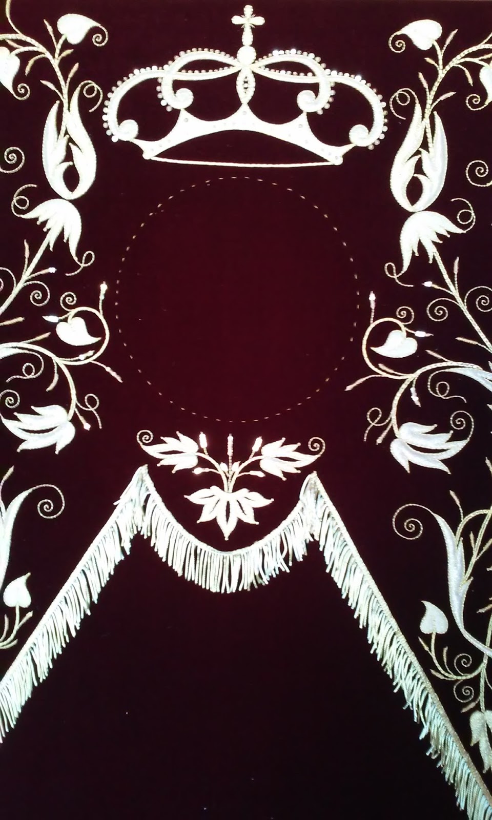 Estandarte realizado con técnica de aplicacionesen oro sobre terciopelo burdeos.