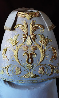 Vistas de manto realizada con la técnica de aplicaciones en oro y sedas sobre terciopelo burdeos.